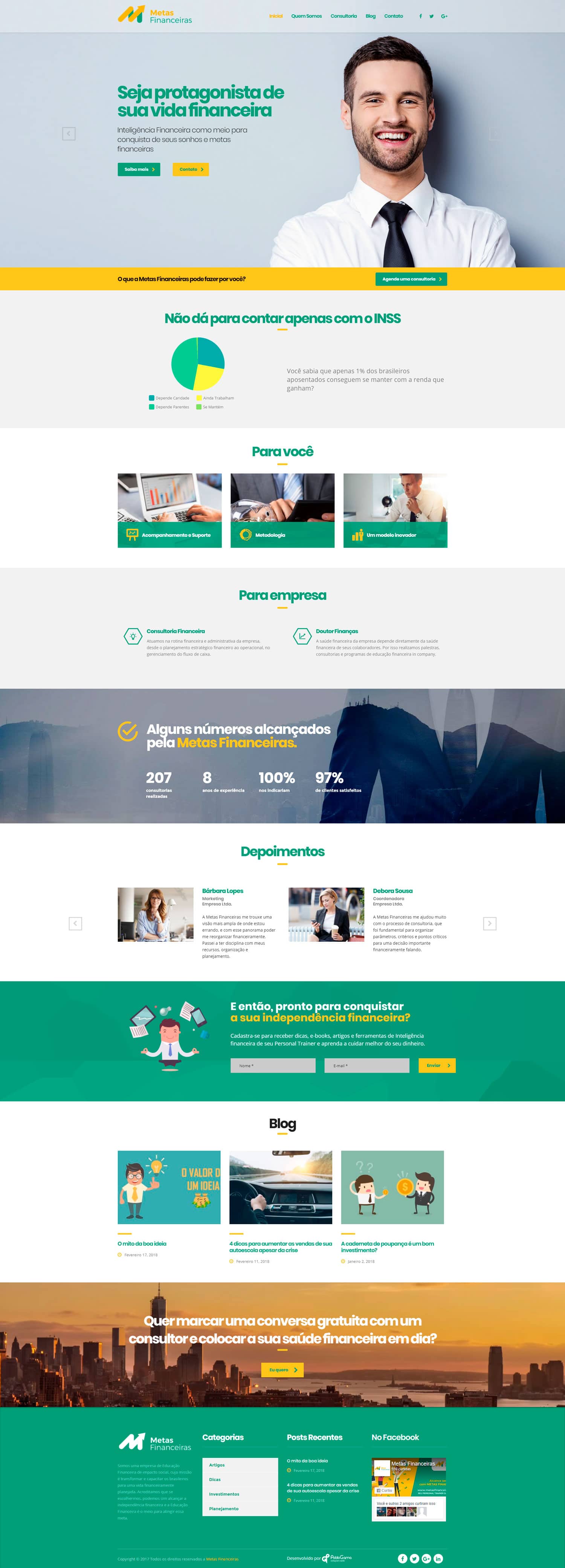 O Metas Financeiras, foi um trabalho realizado no ano de 2017. O site foi desenvolvido utilizando a plataforma WordPress para gestão do seu conteúdo, sendo completamente dinâmico e responsivo, que possibilita o site se dimensiona e se encaixa aos diferentes tamanhos de tela (desktop, tablet e mobile).
